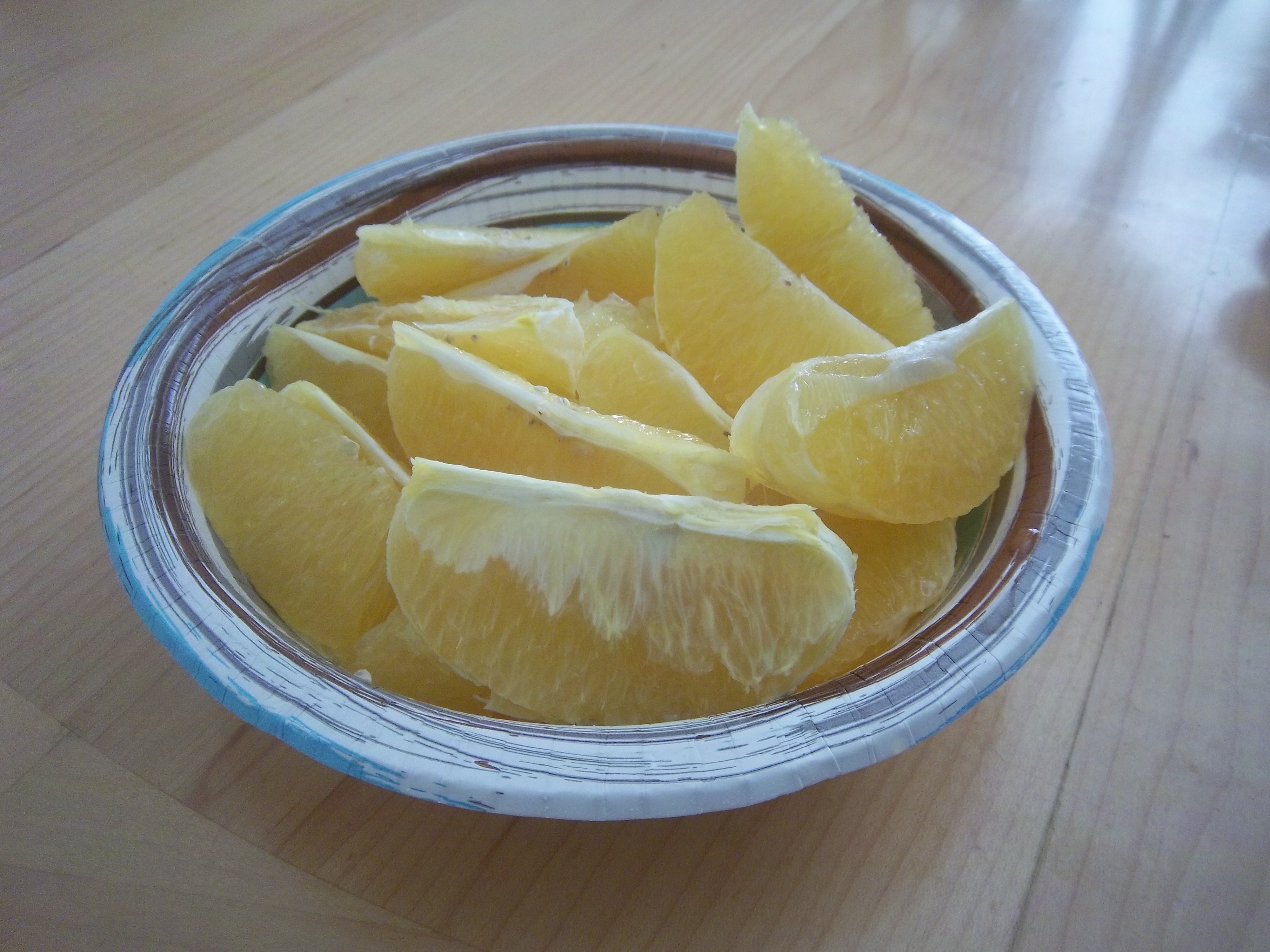 Man, it’s delicious!! Sweeter than a grapefruit ~ takes the edge of the tartness off. And so, just half of a pomelo was sliced into 6 large pieces and filled up a bowl. It was enough for breakfast. (Sidebar: If I ever make raw vegan sushi again, adding a sliver of pomelo would make it look and taste amazing!)